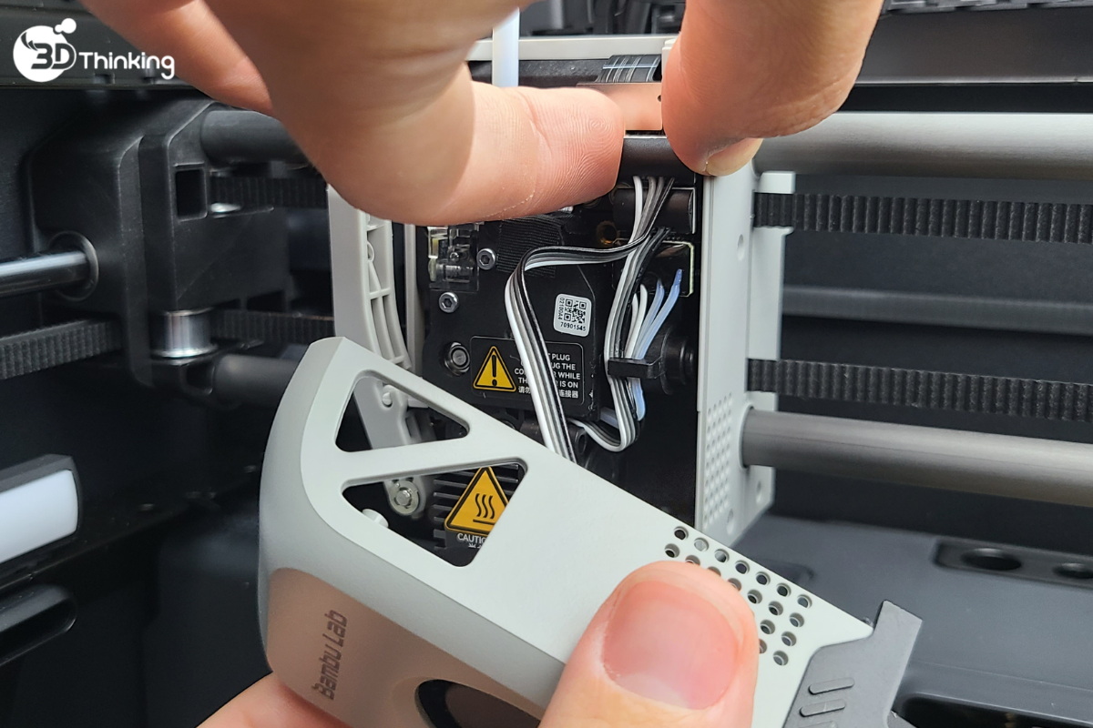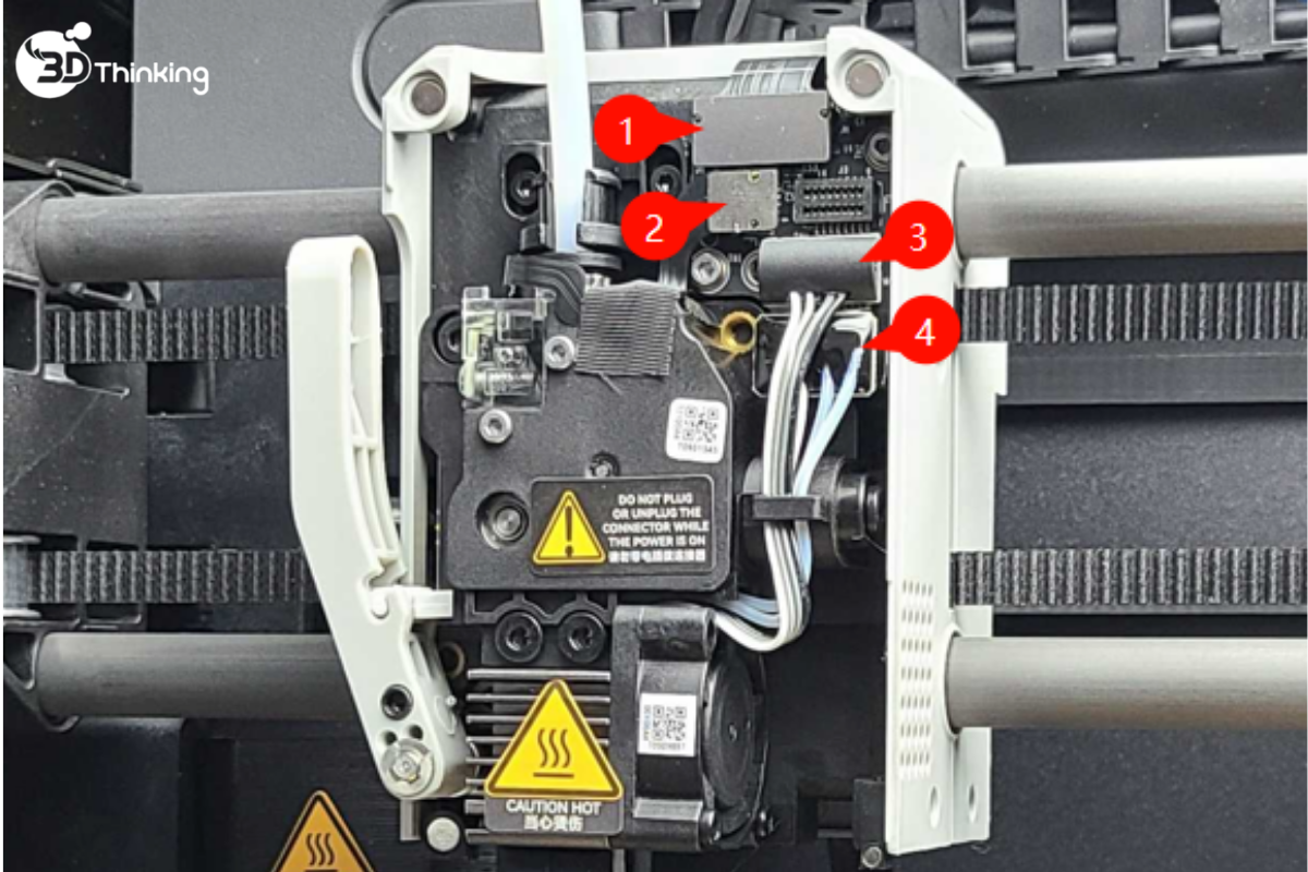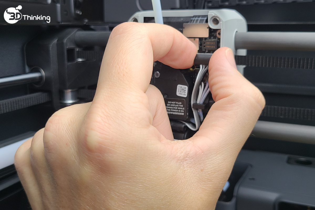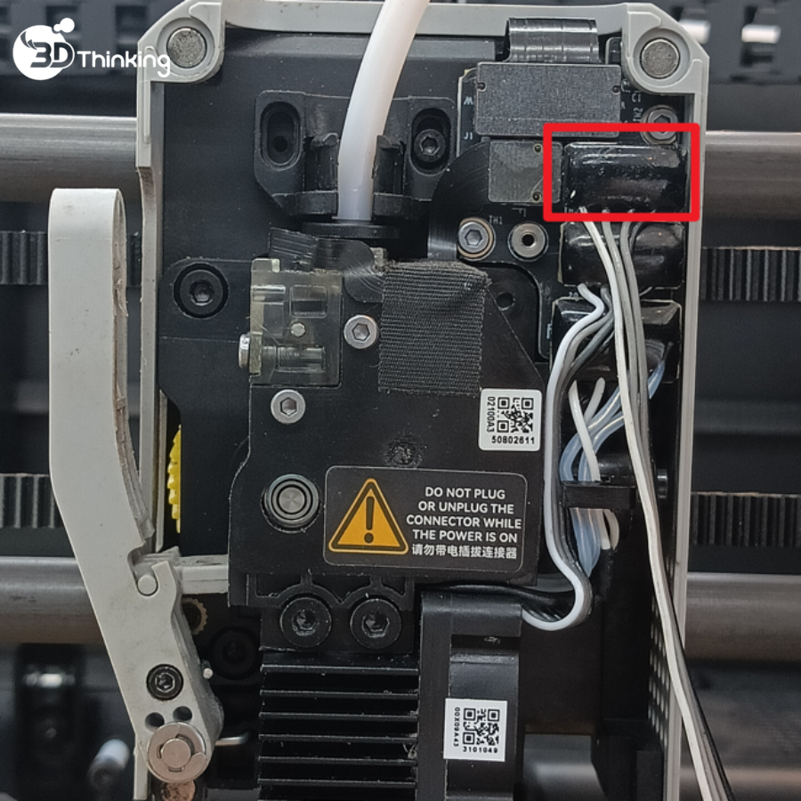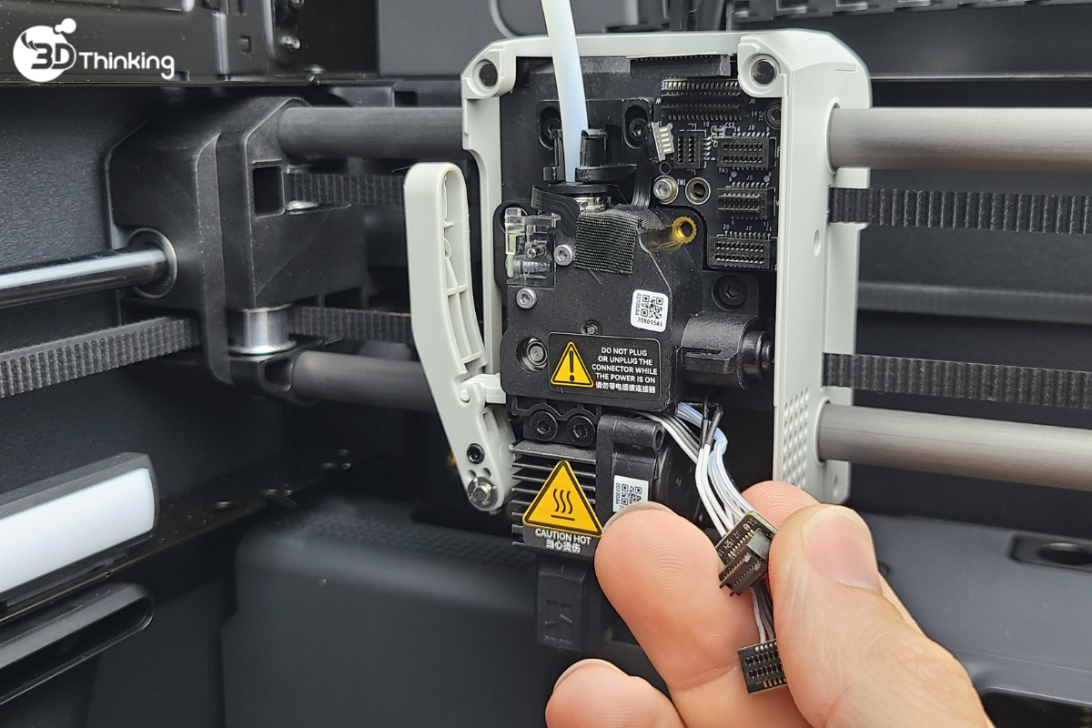 Trong quá trình tháo cụm đầu nóng (hotend), các dây điện sẽ lộ ra. Nếu còn nguồn điện, việc tiếp xúc có thể gây lỗi hệ thống nghiêm trọng.